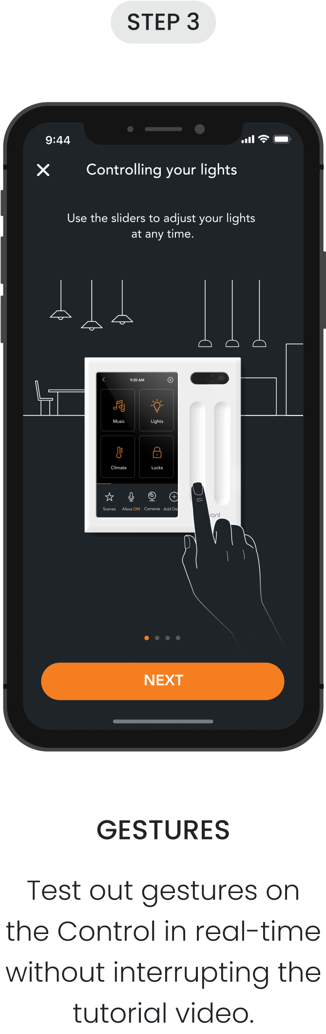 I took this project as an opportunity to add new animations that could better demonstrate how different gestures can adjust the smart lights in various ways (ex: turning on ONE light vs. ALL of the lights in the room) and give this feature an updated look as an added bonus. The original tutorial on the Control was a video of someone performing the different gestures, but only explained how the lights are controlled differently in writing.